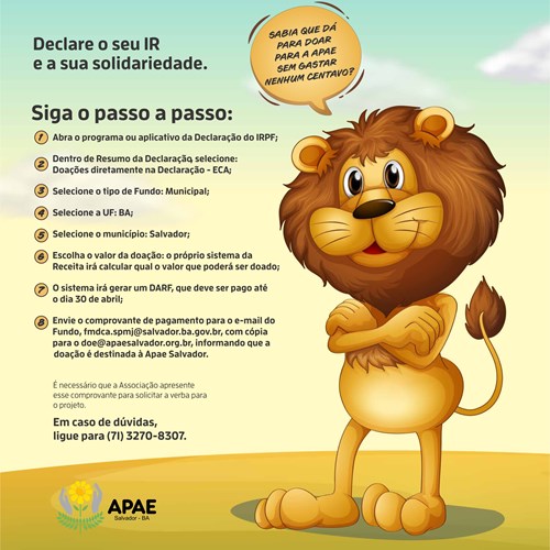 O presidente da Apae Salvador, Derval Evangelista, lançou uma campanha "Declare seu Imposto de Renda e a sua Solidariedade". Até o dia 30 de abril, todo contribuinte que fazer a declaração pelo modo completo pode destinar 3% do imposto devido ao Fundo Municipal dos Direitos da Criança e do Adolescente (FMDCA), sem afetar o valor da restituição. Esta é uma oportunidade de ajudar a Apae a ampliar os serviços de humanização do Centro Especializado em Reabilitação, no bairro de Coutos, por meio do projeto Mais CER, que auxiliará na reabilitação de crianças e adolescentes do subúrbio de Salvador.